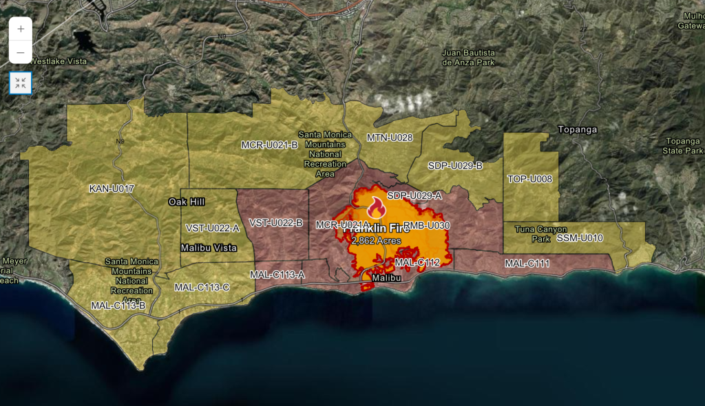 Real-time fire maps provided by Los Angeles County Fire Department show the Franklin Fire stretching from Malibu Canyon Road to the Pacific Coast Highway (PCH), threatening neighborhoods like Malibu Knolls, Sweetwater Mesa, and the historic Malibu Pier. The PCH has been closed from Carbon Canyon to Corral Canyon, and traffic signals in affected areas are malfunctioning due to power outages.