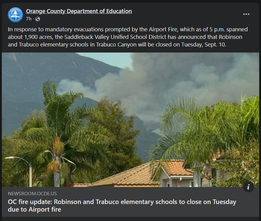 As of Monday evening, the Airport Fire has forced the closure of two elementary schools, Robinson and Trabuco Elementary, in response to the escalating situation. The Saddleback Valley Unified School District announced that both schools would be closed on Tuesday, September 10, with plans to resume normal operations depending on further guidance from the OCFA and the Orange County Sheriff’s Department.