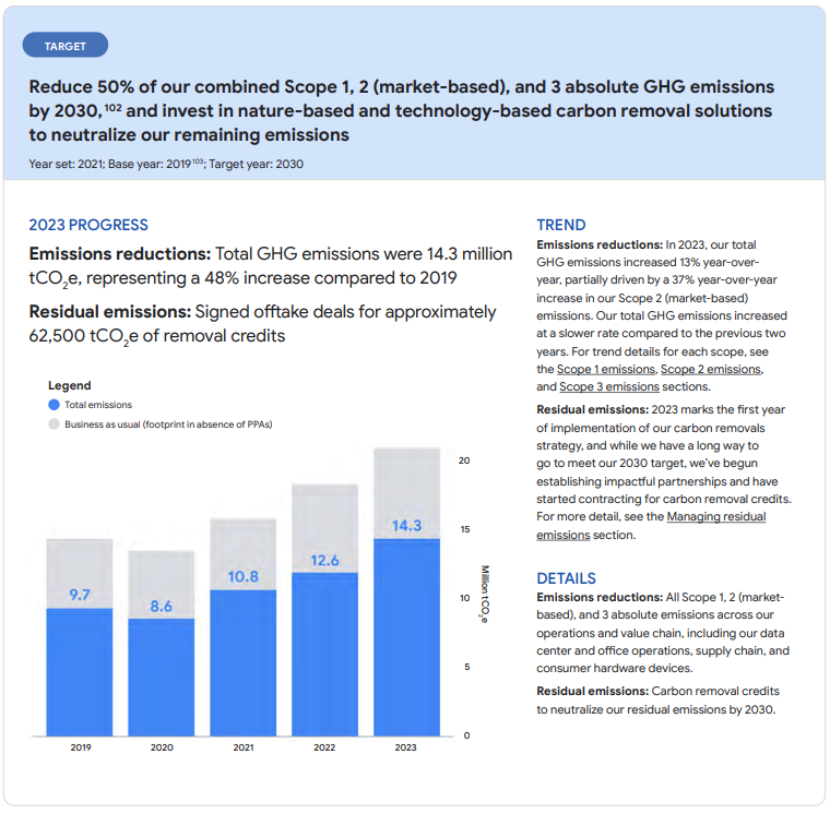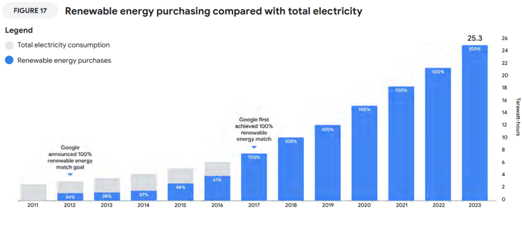 Google has been a significant purchaser of renewable energy to meet its climate goals. The company became the first major company to match 100% of its annual electricity consumption with renewable energy in 2017 and has maintained this achievement every year since. In 2023, Google signed contracts to purchase approximately four gigawatts of clean energy generation capacity, more than in any prior year.