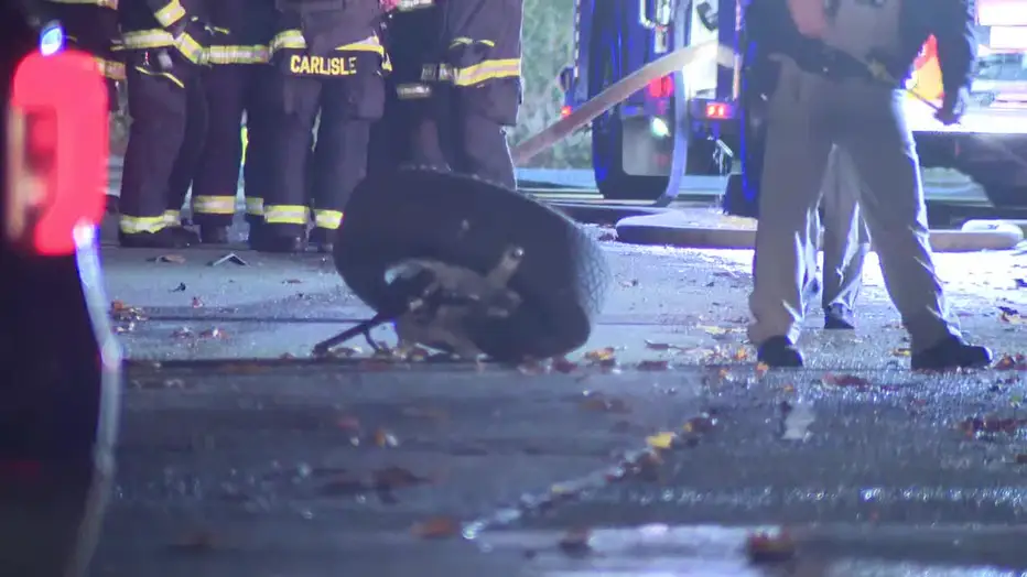 A tire is seen following the deadly Piedmont crash Cybertruck. (Image Credit: Fox 2 KTVU)
