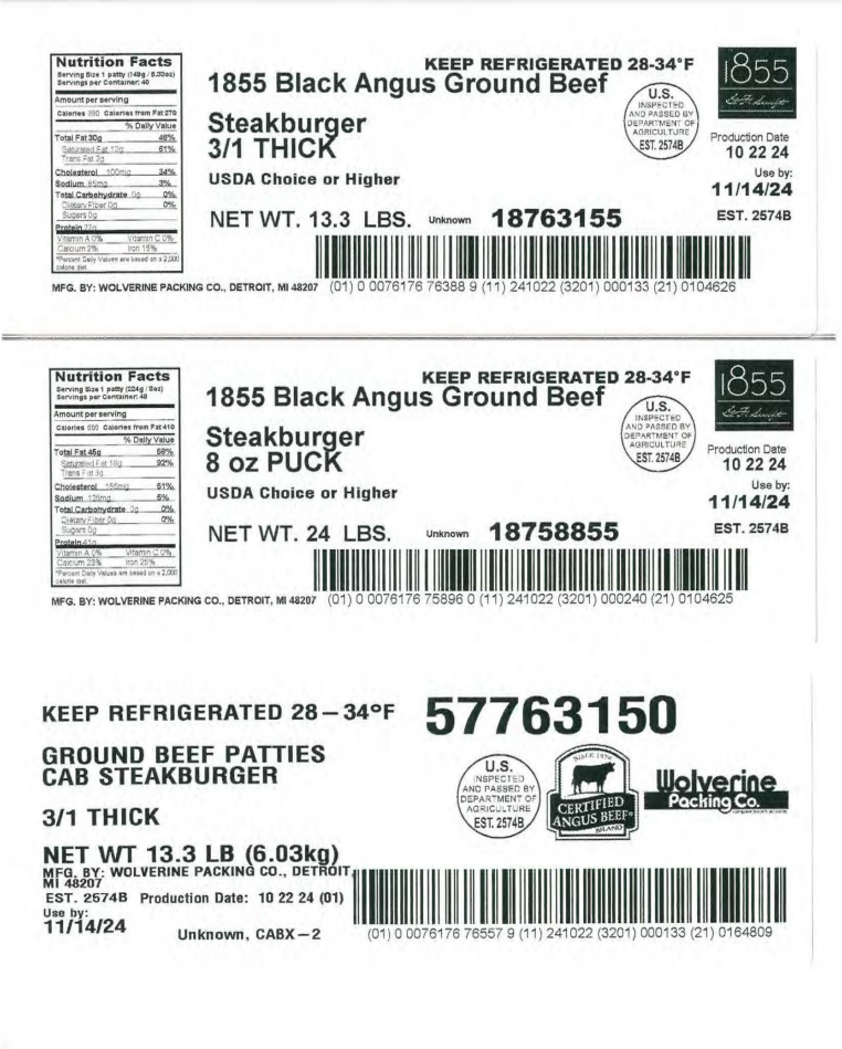 The recall involves both fresh and frozen ground beef products. Fresh products are marked with a “use by” date of November 14, 2024, while frozen products bear a production date of October 22, 2024. These items are identified by the establishment number “EST. 2574B” within the USDA mark of inspection.